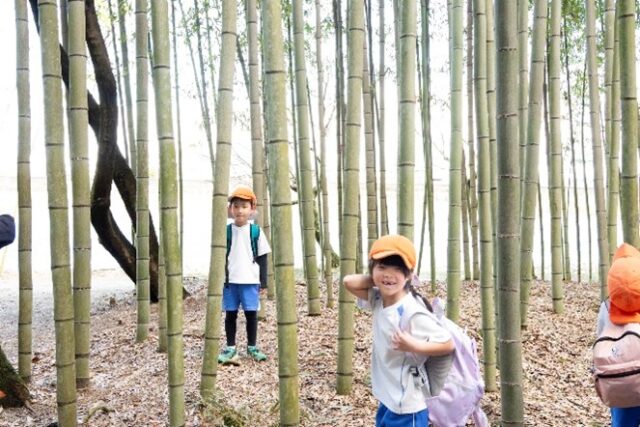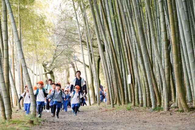 鳩吹山カタクリ口登山駐車場から、可児川堤防をみんなで歩き、公園に到着、かぐや姫散歩道を散策、たくさんの竹の中をみんなで歩きました!