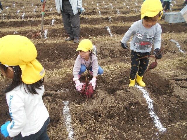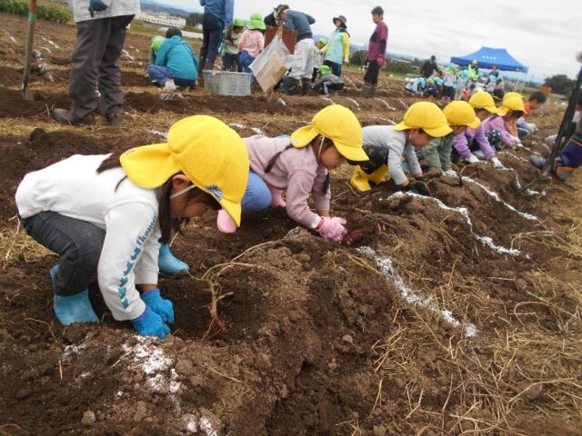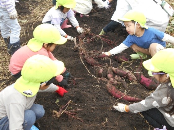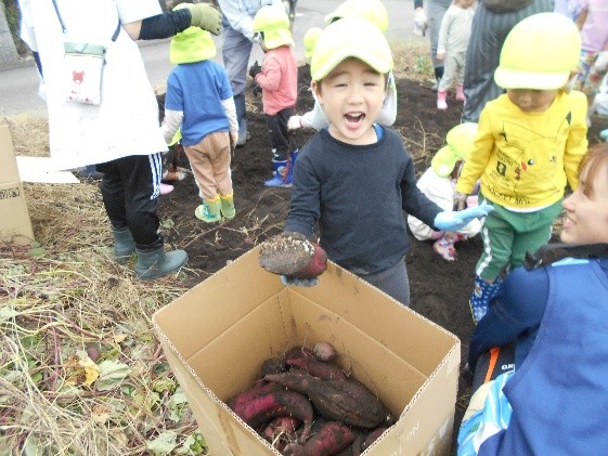 秋といえば「芋ほり」です!もも組は園長先生のご自宅の畑に、ひまわり組、さくら組は「ふるさと農園」で芋ほり体験をさせてもらいました。畑の土を触る体験がはじめてのお子さんもいました。軍手をはめることも初めて。さつまいもが顔を見せてくれると「わあ!」と喜んでいました。さくら組は「いもきんとん」クッキングをします🍠